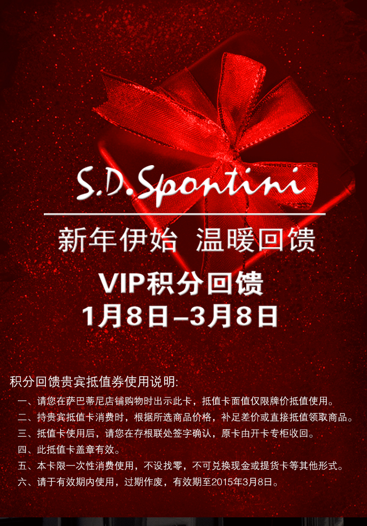 我们深知,每一次的进步和成功,都离不开您的关注和参与。尊敬的S.D.Spontini会员,您的积分回馈礼券已经在路上,我们诚邀您再次莅临S.D.Spontini,也希望我们甄选的产品能够给您一个温暖的冬天。